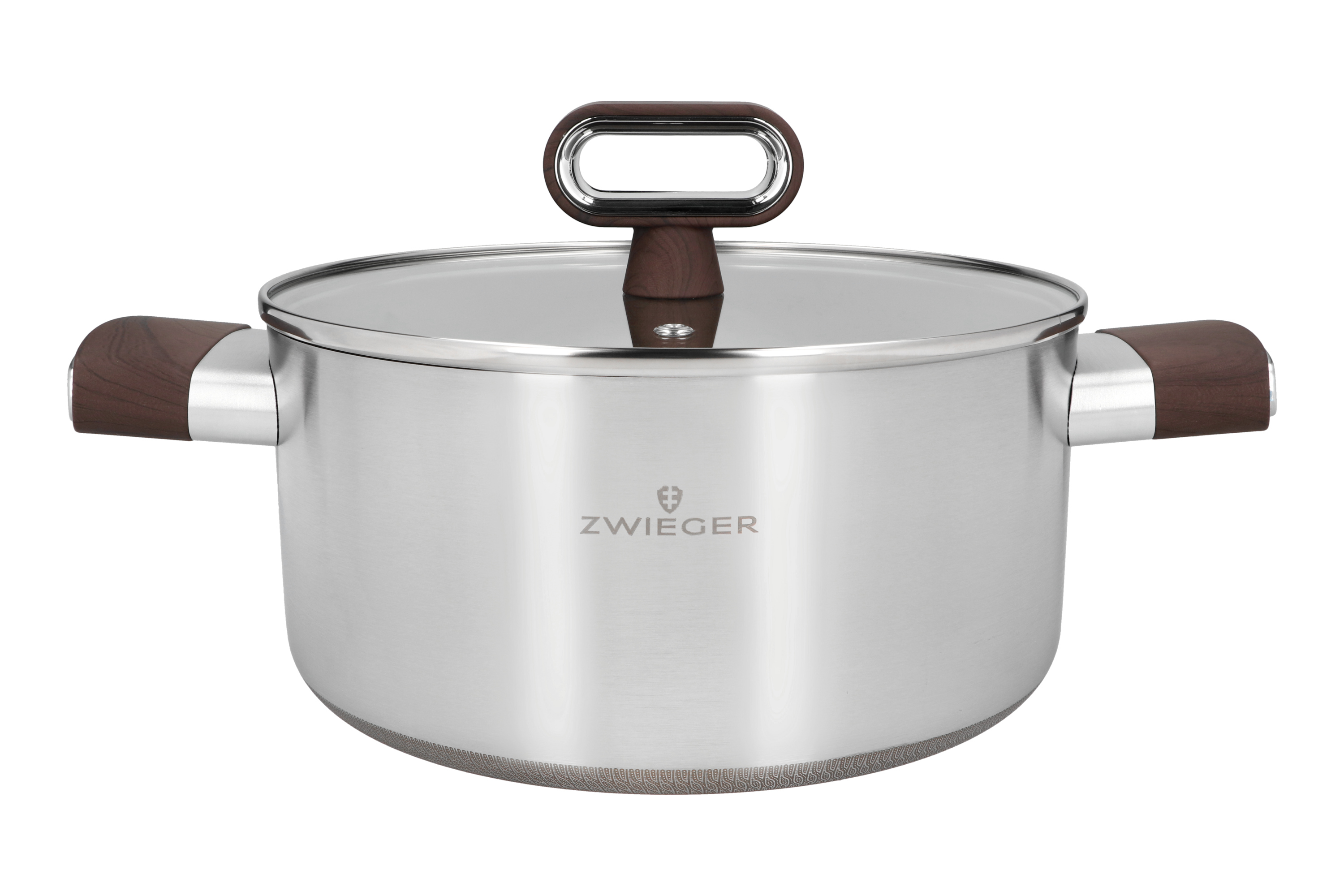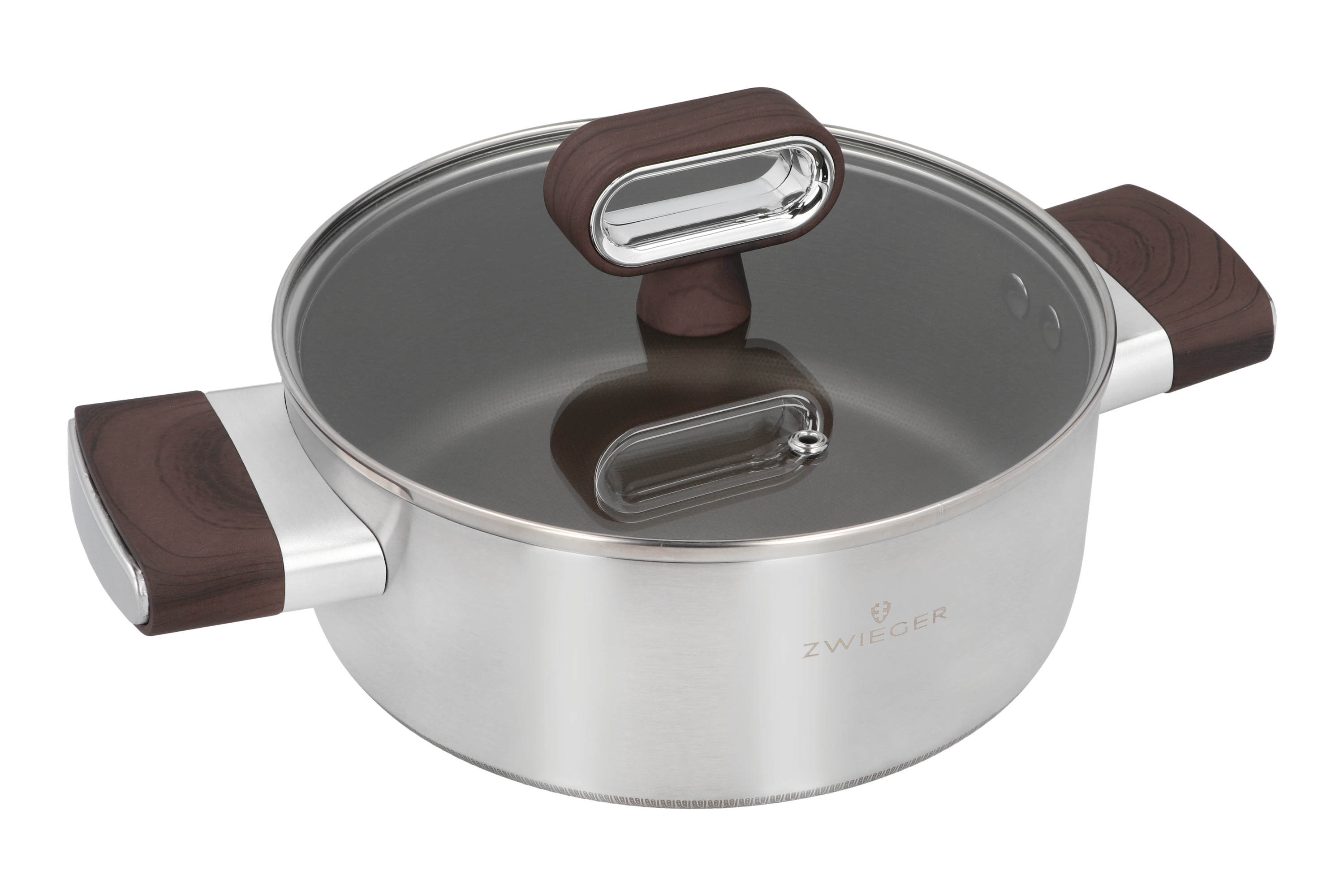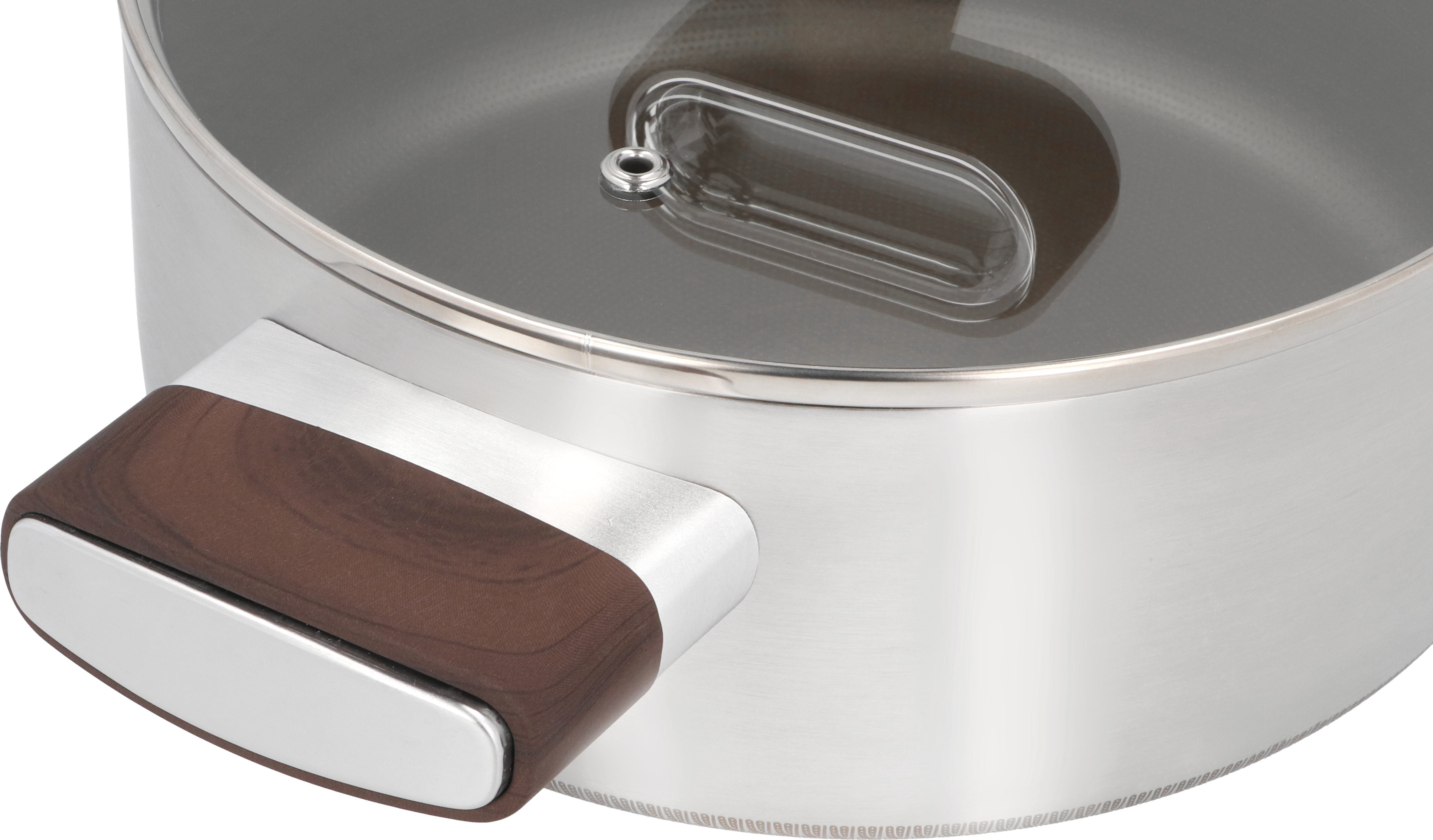 Pokrywa z bezpiecznego szkła hartowanego pozwala na bieżąco kontrolować proces gotowania bez konieczności jej zdejmowania. Wbudowany otwór odprowadzający parę zapobiega wykipieniu i pomaga utrzymać optymalną temperaturę wewnątrz naczynia. Solidny uchwyt pokrywy gwarantuje wygodne i bezpieczne użytkowanie nawet przy gorących potrawach. Przyjemne w dotyku uchwyty garnka pokryte powłoką w kolorze ciemnego drewna są ergonomiczne i odporne na nagrzewanie, co zwiększa komfort i bezpieczeństwo gotowania. Dzięki nim garnek pewnie leży w dłoniach i łatwo przenosi się z kuchenki bez ryzyka poparzenia. Dzięki strukturalnemu dnu indukcyjnemu garnek TitanCore współpracuje z każdym rodzajem kuchenki — gazową, elektryczną, ceramiczną i indukcyjną. Dno nagrzewa się szybko i równomiernie, co pozwala skrócić czas gotowania i ograniczyć zużycie energii. TitanCore to garnek stworzony dla tych, którzy oczekują czegoś więcej niż standard. Trwały, funkcjonalny i elegancki — będzie niezawodnym wsparciem w codziennym gotowaniu przez długie lata.