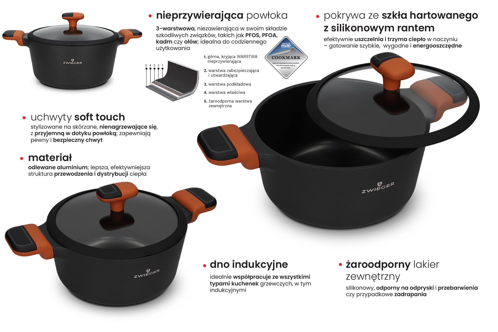 - ŻAROODPORNY LAKIER SILIKONOWY – pokrywa warstwę zewnętrzną naczynia; odporny na przebarwienia, odpryski oraz przypadkowe zadrapania