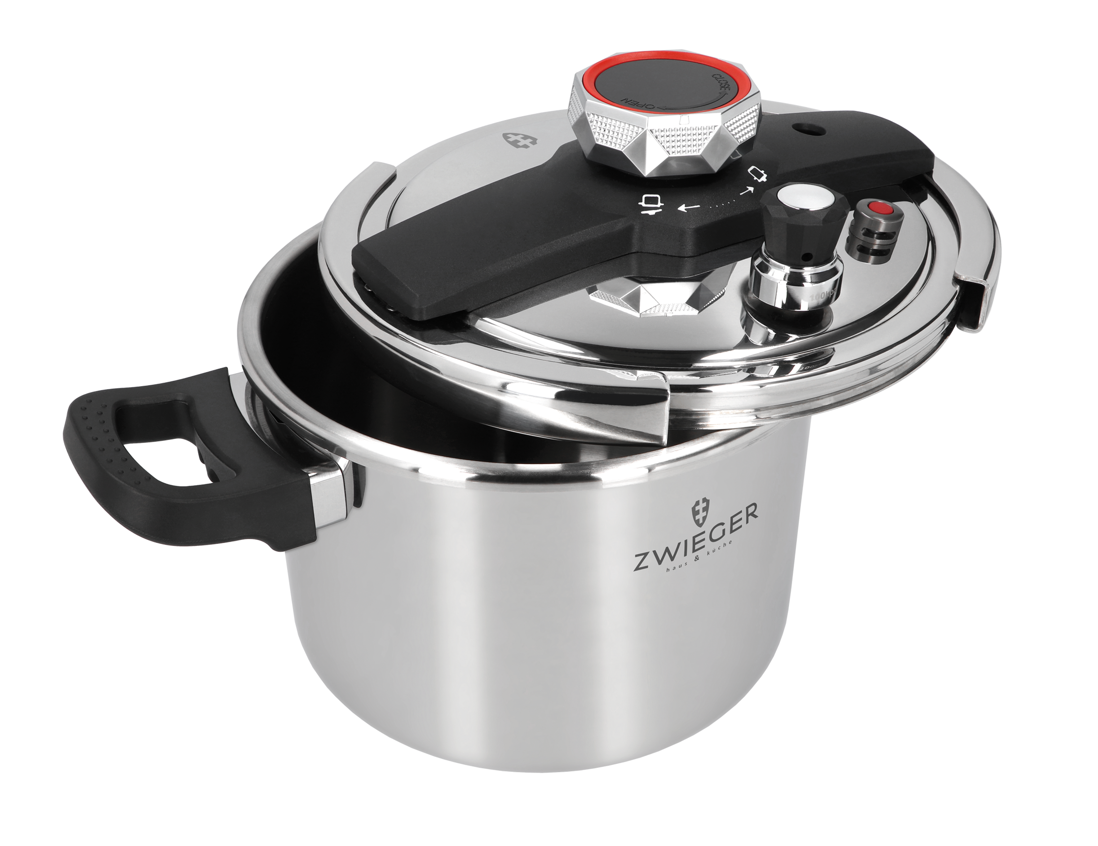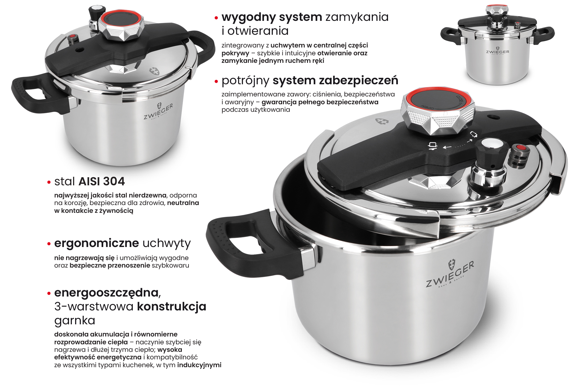 Szybkowar VERANO to naczynie zaprojektowane z myślą o codziennym, wygodnym i zdrowym gotowaniu. Wewnątrz zastosowano najwyższej jakości stal nierdzewną AISI 304, która jest nie tylko w pełni bezpieczna dla zdrowia, ale też neutralna w kontakcie z żywnością i odporna na korozję. Stal ta to materiał wybierany do produkcji profesjonalnych naczyń — jest trwały, higieniczny i niewymagający specjalnej pielęgnacji. Szybkowar wyposażono w ergonomiczne uchwyty, które pozostają chłodne nawet podczas intensywnego gotowania. Dzięki temu przenoszenie czy odstawianie naczynia po zakończonej pracy jest zawsze wygodne i bezpieczne. Sercem szybkowaru jest energooszczędna, 3-warstwowa konstrukcja dna, która gwarantuje szybkie nagrzewanie, równomierne rozprowadzanie ciepła i dłuższe jego utrzymywanie. To realna oszczędność czasu i energii — niezależnie od tego, czy gotujesz na indukcji, gazie czy płycie ceramicznej. Za komfort codziennej obsługi odpowiada intuicyjny system otwierania i zamykania, zintegrowany z uchwytem w centralnej części pokrywy. Jeden ruch ręki i szybkowar jest gotowy do pracy — bez siłowania się i bez zbędnych mechanizmów. Całość uzupełnia potrójny system zabezpieczeń, obejmujący zawór ciśnienia, zawór bezpieczeństwa i zawór awaryjny. To gwarancja najwyższego poziomu bezpieczeństwa podczas gotowania, nawet przy pełnym wykorzystaniu możliwości szybkowaru.