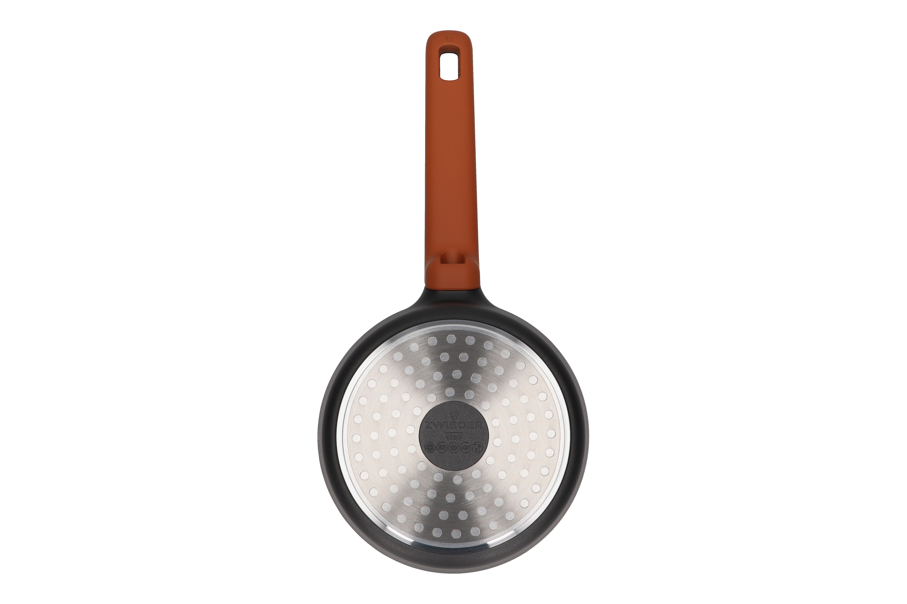 Rondel VERDI została zaprojektowany z myślą o wygodnym, codziennym gotowaniu. To połączenie trwałych materiałów, praktycznych rozwiązań i nowoczesnego designu, który dobrze odnajdzie się w każdej kuchni. Wnętrze naczynia pokryto wysokiej jakości 3-warstwową powłoką nieprzywierającą Cookmark firmy PFLUON, która ułatwia przygotowywanie potraw i znacząco ogranicza ryzyko przywierania składników. Dzięki temu gotowanie wymaga mniejszej ilości tłuszczu, a samo czyszczenie rondla jest znacznie prostsze. Powłoka nie zawiera szkodliwych związków, takich jak PFOS, PFOA, kadm czy ołów, dzięki czemu jest bezpieczna w codziennym użytkowaniu. Komfort pracy zwiększa ergonomiczna, stylizowana na skórzaną rączka typu soft touch, która nie nagrzewa się podczas użytkowania i jest wyjątkowo przyjemna w dotyku. Zapewniają pewny, stabilny chwyt i sprawiają, że przenoszenie naczynia jest wygodne i bezpieczne. Rondel VERDI wyposażono w dno indukcyjne, które zapewnia odpowiednią współpracę ze wszystkimi typami kuchenek – od gazowych i elektrycznych, aż po płyty indukcyjne. Konstrukcja dna pomaga w równomiernym rozprowadzaniu ciepła, co przekłada się na bardziej stabilne gotowanie i lepszą kontrolę nad temperaturą.