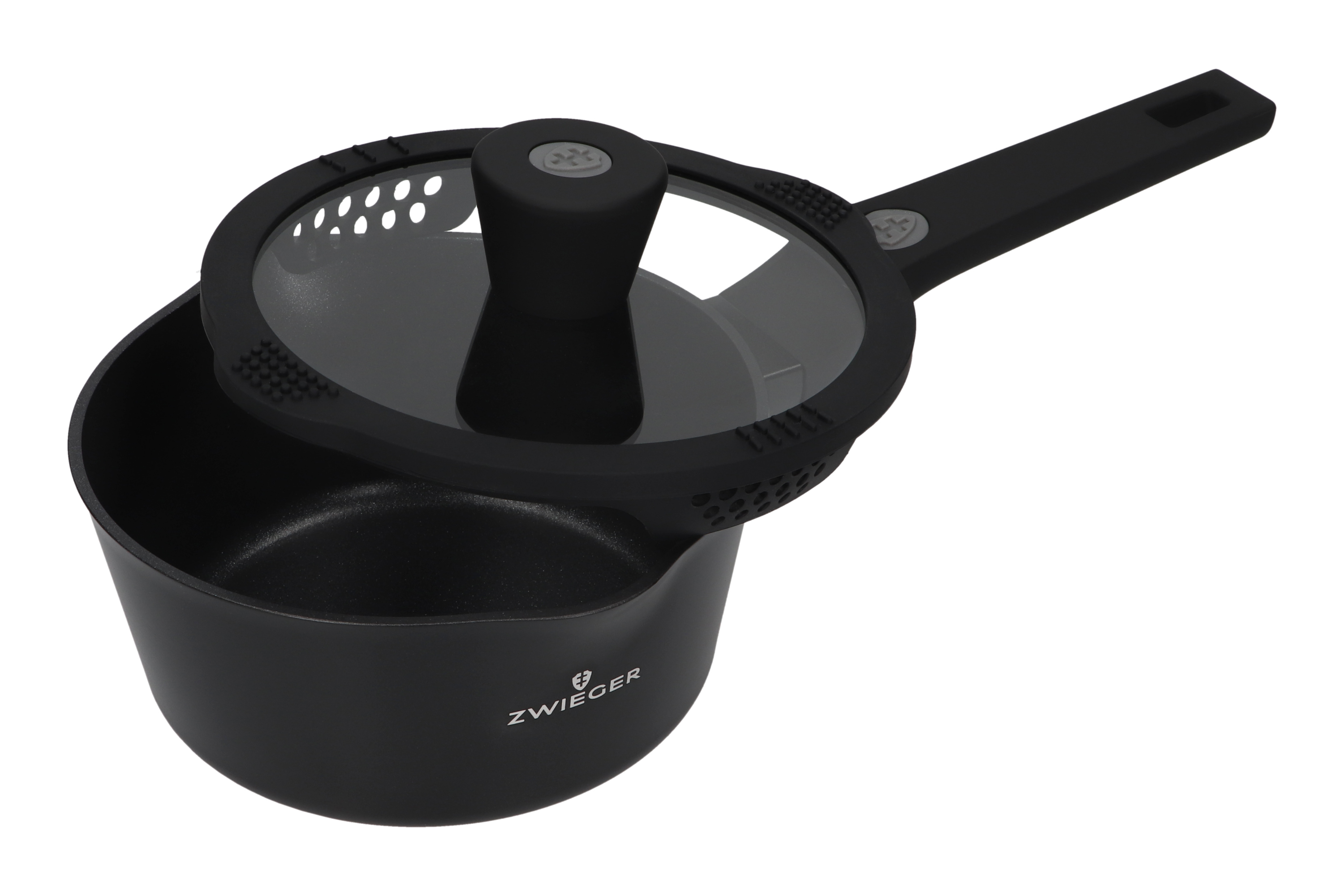 - SYSTEM BEZPIECZNEGO I WYGODNEGO ODLEWANIA – Składający się ze specjalnych wypustek na silikonowym rancie, dwóch profilów różnej wielkości w pokrywie pozwalających odcedzać płyny z różną intensywnością oraz dwustronnej wylewce