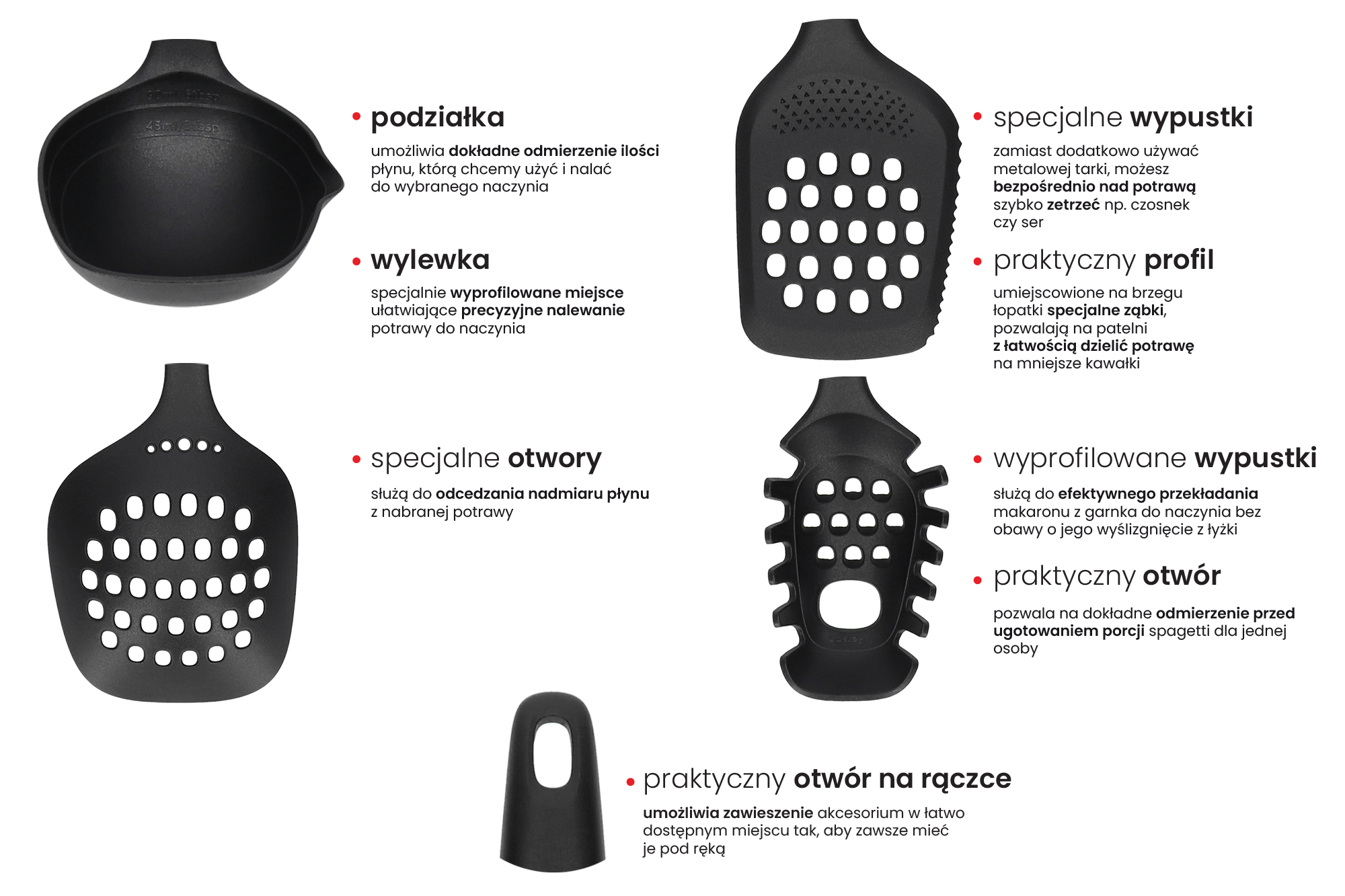 Zestaw akcesoriów Black Stone to nowoczesna forma i niezwykła funkcjonalność. Wykonane z tworzywa PA66, a zaprojektowane z myślą o wysokim komforcie użytkowania. Idealne uzupełnienie patelni i garnków z linii Black Stone.