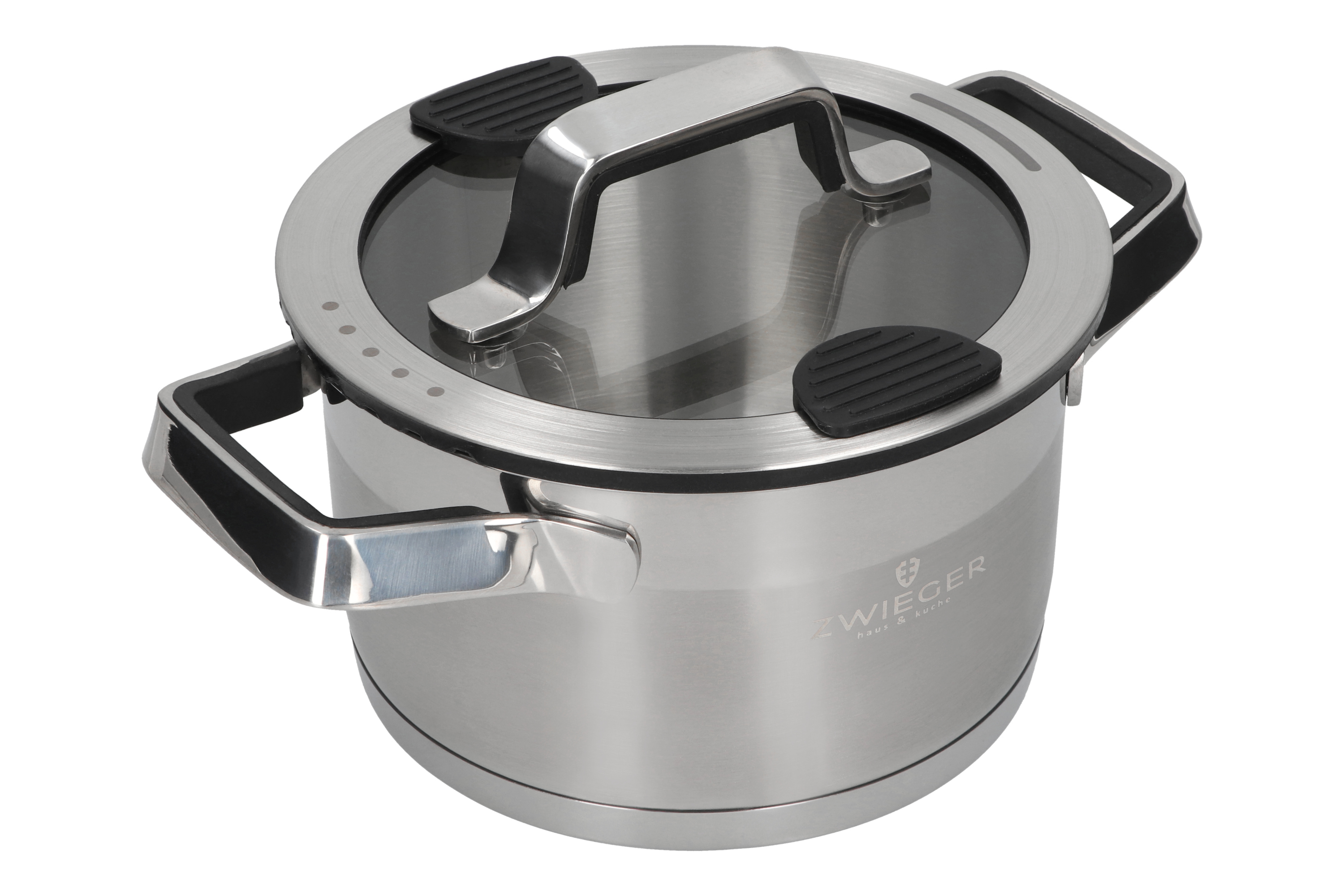 - SYSTEM WYGODNEGO ODCEDZANIA – zawarty w pokrywie wykonanej z bezpiecznego szkła hartowanego z silikonowymi nakładkami oraz otworami odprowadzającymi nadmiar pary, umożliwiającymi jednocześnie, w dwóch wariantach, wygodne i bezpieczne odcedzanie wody