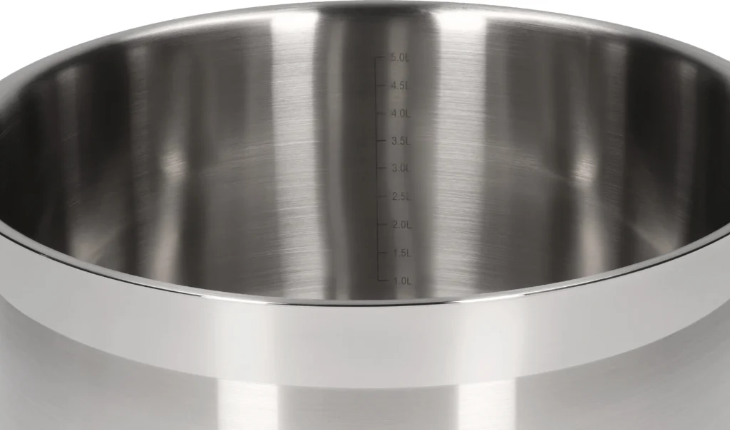 - DNO INDUKCYJNE – grube dno kapslowe, idealnie współpracuje ze wszystkimi typami kuchenek, w tym indukcyjnymi, akumuluje i rozprowadza ciepło równomiernie, co daje wysoką energooszczędność
