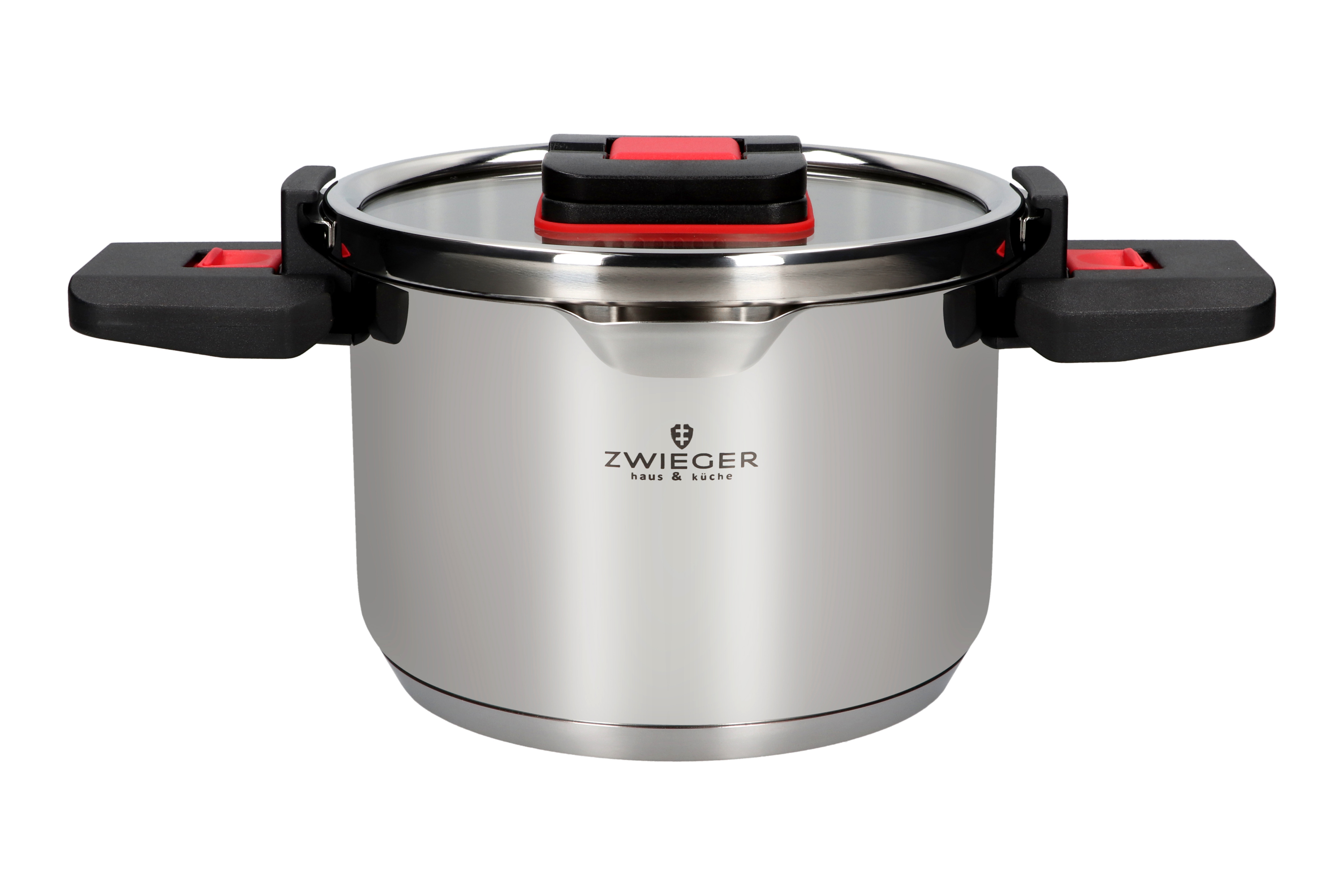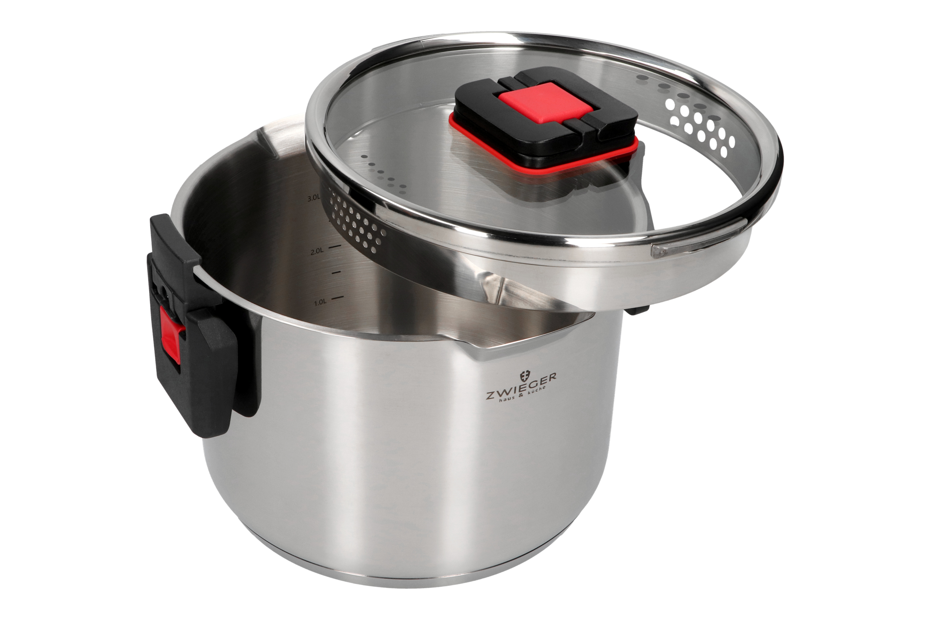 - SYSTEM BEZPIECZNEGO I WYGODNEGO ODCEDZANIA – zaimplementowany w pokrywie innowacyjny i praktyczny kołnierz do odcedzania wody, specjalnie blokowane uchwyty oraz dodatkowe, umiejscowione w uchwytach zapięcia zabezpieczające pokrywę, pozwalają, bez dodatkowych akcesoriów, bezpiecznie odlewać gorącą wodę z naczynia