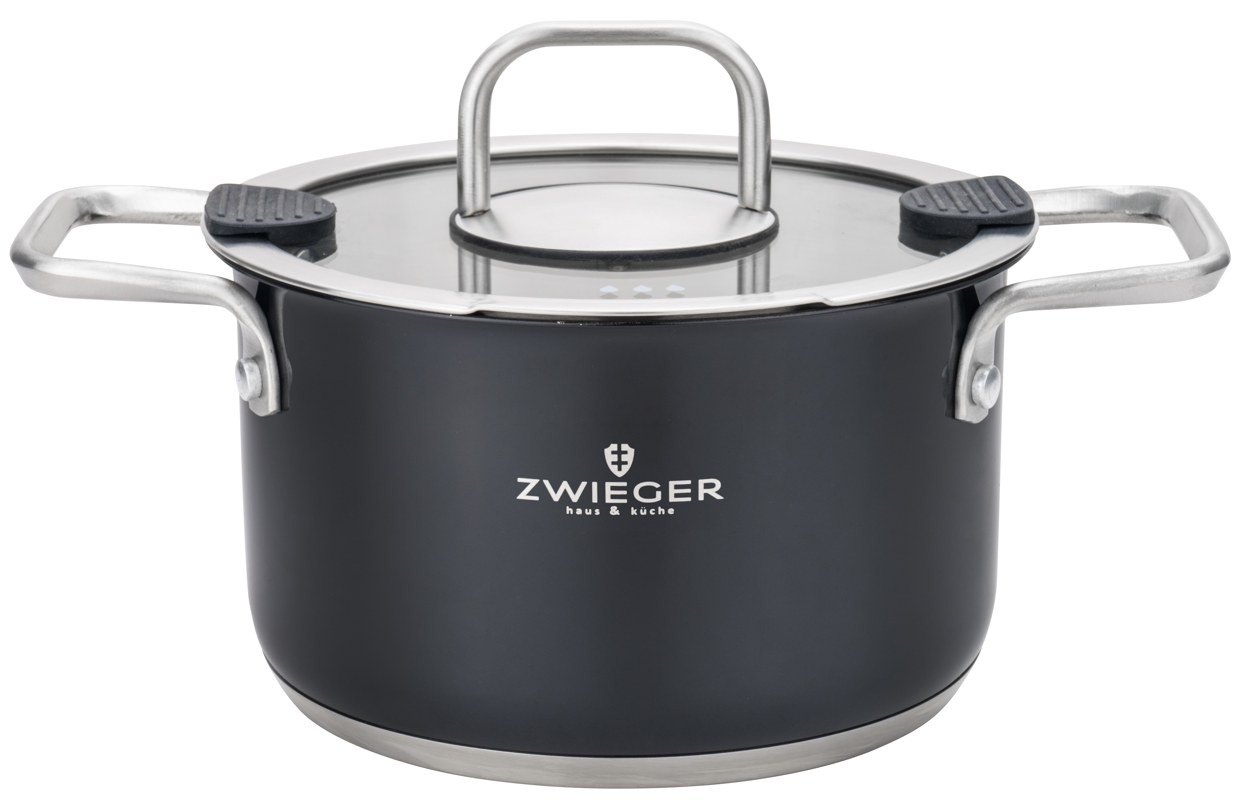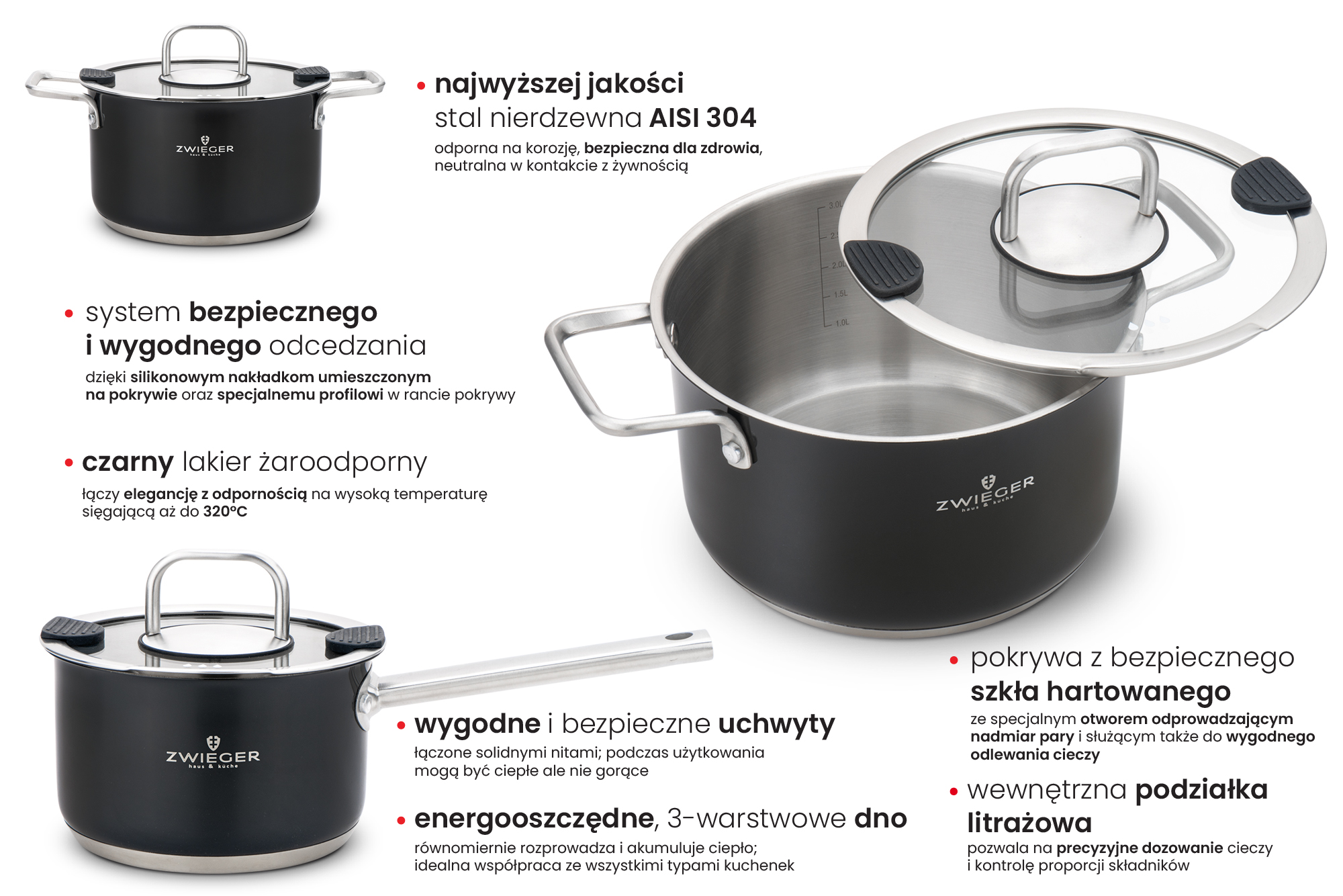 Linia garnków NOCTA to połączenie ponadczasowej elegancji czerni z najwyższej klasy wykonaniem ze stali nierdzewnej AISI 304 – materiału odpornego na korozję, całkowicie bezpiecznego dla zdrowia i neutralnego w kontakcie z żywnością. Każdy detal został zaprojektowany z myślą o wygodzie i trwałości. Uchwyty, łączone solidnymi nitami, zapewniają pewny, bezpieczny chwyt i – choć mogą być ciepłe podczas dłuższego gotowania – nigdy nie stają się gorące. 3-warstwowe, energooszczędne dno równomiernie akumuluje i rozprowadza ciepło, dzięki czemu gotowanie jest szybkie, efektywne i możliwe na każdym rodzaju kuchenki, w tym indukcyjnej. Pokrywa z hartowanego szkła została wyposażona w otwór odprowadzający nadmiar pary oraz system bezpiecznego odcedzania – silikonowe nakładki i specjalny profil w rancie pozwalają wygodnie odcedzić wodę bez ryzyka poparzenia czy rozlania. Całość wieńczy czarny, żaroodporny lakier, który nadaje garnkom wyjątkowy charakter i odporność na temperatury sięgające nawet 320°C. Wewnątrz każdego naczynia znajduje się czytelna podziałka litrażowa, ułatwiająca precyzyjne dozowanie składników.
