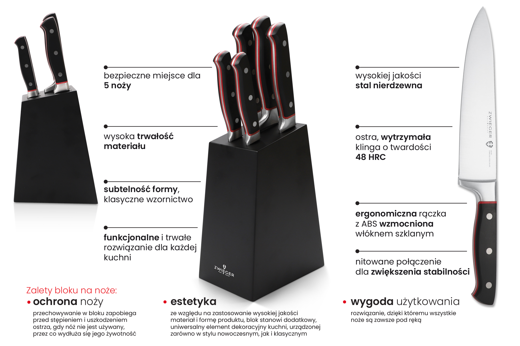 Blok z zestawem 5 noży KLASSIKER to połączenie funkcjonalności, trwałości i nowoczesnego wzornictwa. Wykonany z trwałego, estetycznego i będącego nowoczesną alternatywą dla drewna tworzywa MDF. Wykończony został czarnym lakierem silikonowym i doskonale wpisuje się w minimalistyczne aranżacje kuchni. Zestaw zawiera pięć najczęściej używanych noży kuchennych, zapewniając im praktyczne i bezpieczne miejsce przechowywania. Noże te zostały wykonane z wysokiej jakości stali nierdzewnej o twardości 48 HRC, co gwarantuje wytrzymałość ostrzy i stosunkowo rzadkie ich późniejsze ostrzenie. Ergonomiczne rękojeści z tworzywa ABS, dodatkowo wzmocnione włóknem szklanym i ozdobione czerwoną wstawką, nie tylko świetnie leżą w dłoni, ale również zapewniają trwałość połączeń dzięki nitowanemu łączeniu. Zestaw obejmuje komplet noży niezbędnych w codziennej pracy kuchennej: nóż szefa, nóż do chleba, nóż do plastrowania, nóż uniwersalny oraz nóż do warzyw i owoców. Każdy z nich zaprojektowano z myślą o precyzji cięcia, wygodzie użytkowania i trwałości materiałów.