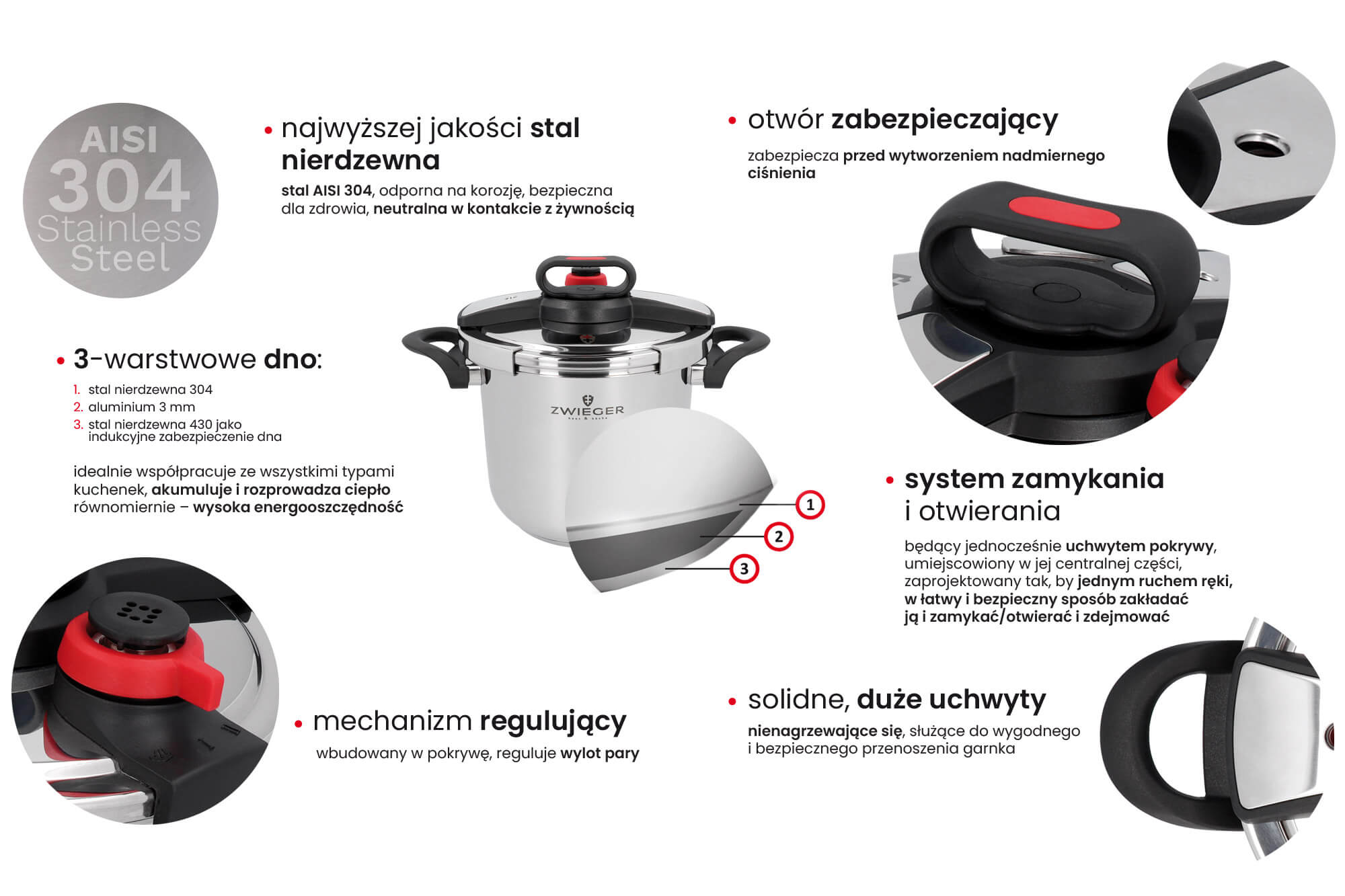 Szybkowar Klassiker to wysokiej klasy produkt, który wykonany został ze stali nierdzewnej AISI 304 – materiału wykorzystywanego do produkcji najlepszych naczyń i akcesoriów kuchennych dostępnych na rynku. Zastosowane w szybkowarze trójwarstwowe dno, w którego skład wchodzą stal AISI 304, dysk aluminiowy i stal AISI 420, zapewnia idealne i równomierne rozprowadzenie ciepła na dnie, a przy tym charakteryzuje się niezwykle wysokim przewodzeniem magnetycznym. Przekłada się to na pełną współpracę także z kuchenkami indukcyjnymi oraz na wysoką energooszczędność. Z myślą o bezpieczeństwie użytkowania, a tym samym by gotowanie było efektywne i niezawodne, konstrukcja naczynia została odpowiednio wzmocniona. Mechanizm regulujący wylot pary oraz zabezpieczający przed wytworzeniem nadmiernego ciśnienia wbudowany został w wykonaną ze stali AISI 304 solidną pokrywę. Tuż obok niego, w centralnej części pokrywy znajduje się uchwyt będący jednocześnie elementem systemu zamykania i otwierania naczynia. Został on zaprojektowany tak, by jednym ruchem ręki, w łatwy i bezpieczny sposób zakładać lub zdejmować pokrywę.