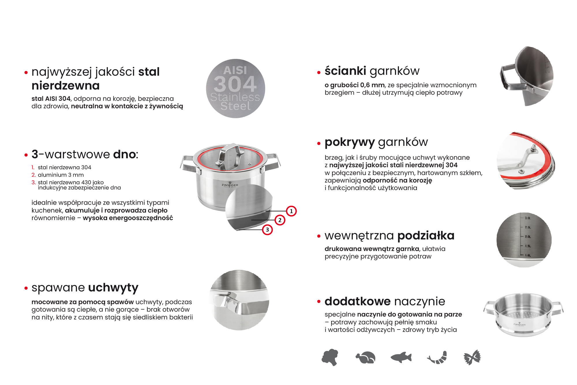 - DNO INDUKCYJNE – GRUBE, 3-warstwowe dno, równomiernie rozprowadza i akumuluje ciepło, wysoka energooszczędność i idealna współpraca ze wszystkimi typami kuchenek