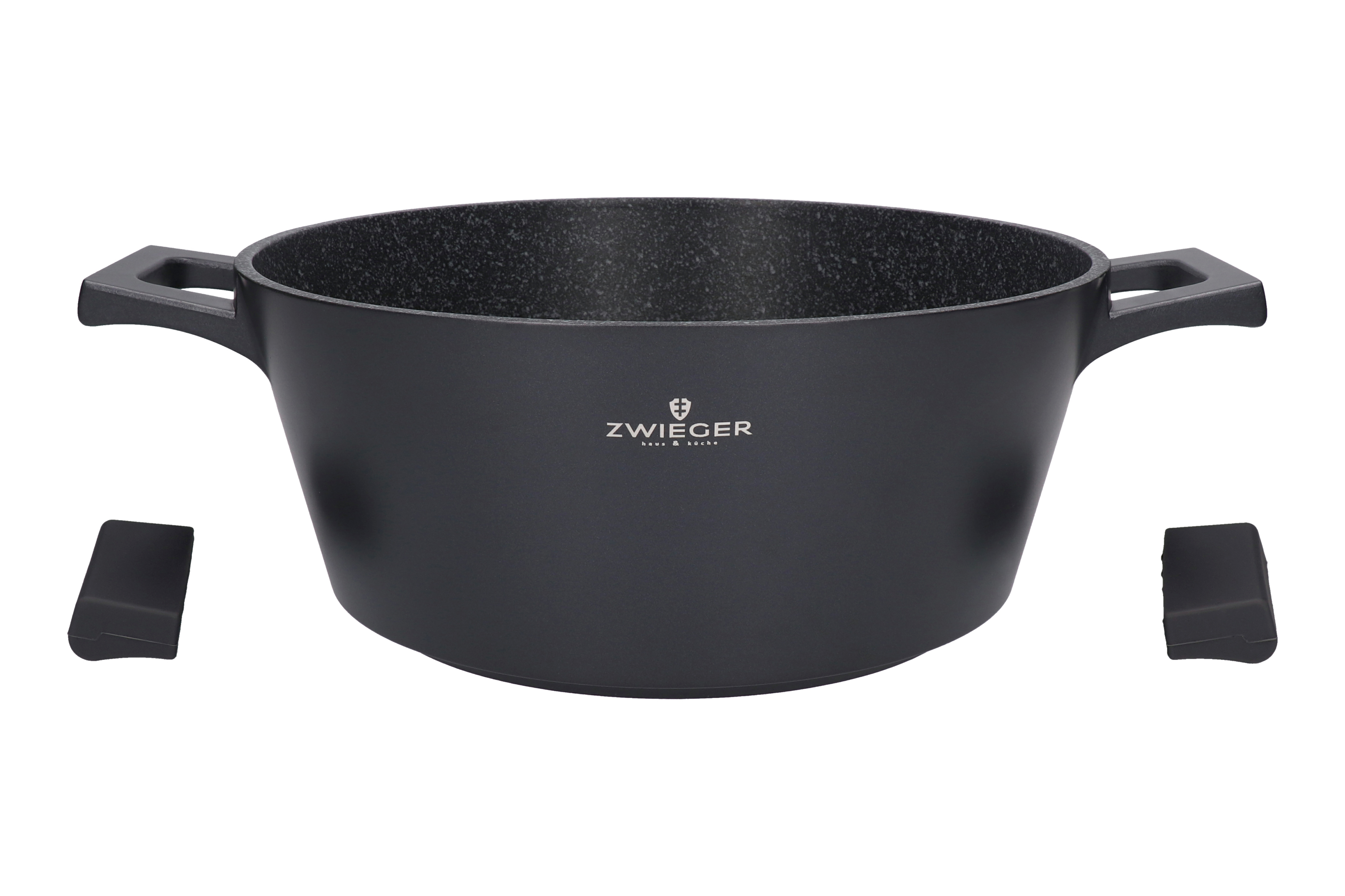 Patelnie Zwieger z odlewanego aluminium. Nowoczesna, niemiecka powłoka GREBLON® pokrywa wewnętrzną część naczynia. Dzięki nowatorskiej technologii patelnia doskonale przewodzi i akumuluje ciepło. Ze względu na swoje wyjątkowe właściwości, zwiększające odporność na zarysowania, powłoka GREBLON® stosowana jest w naczyniach najwyższej klasy. Dodatkowo, żaroodporny lakier silikonowy, który pokrywa patelnię, sprawia, że zachowuje ona swój estetyczny wygląd na długo.