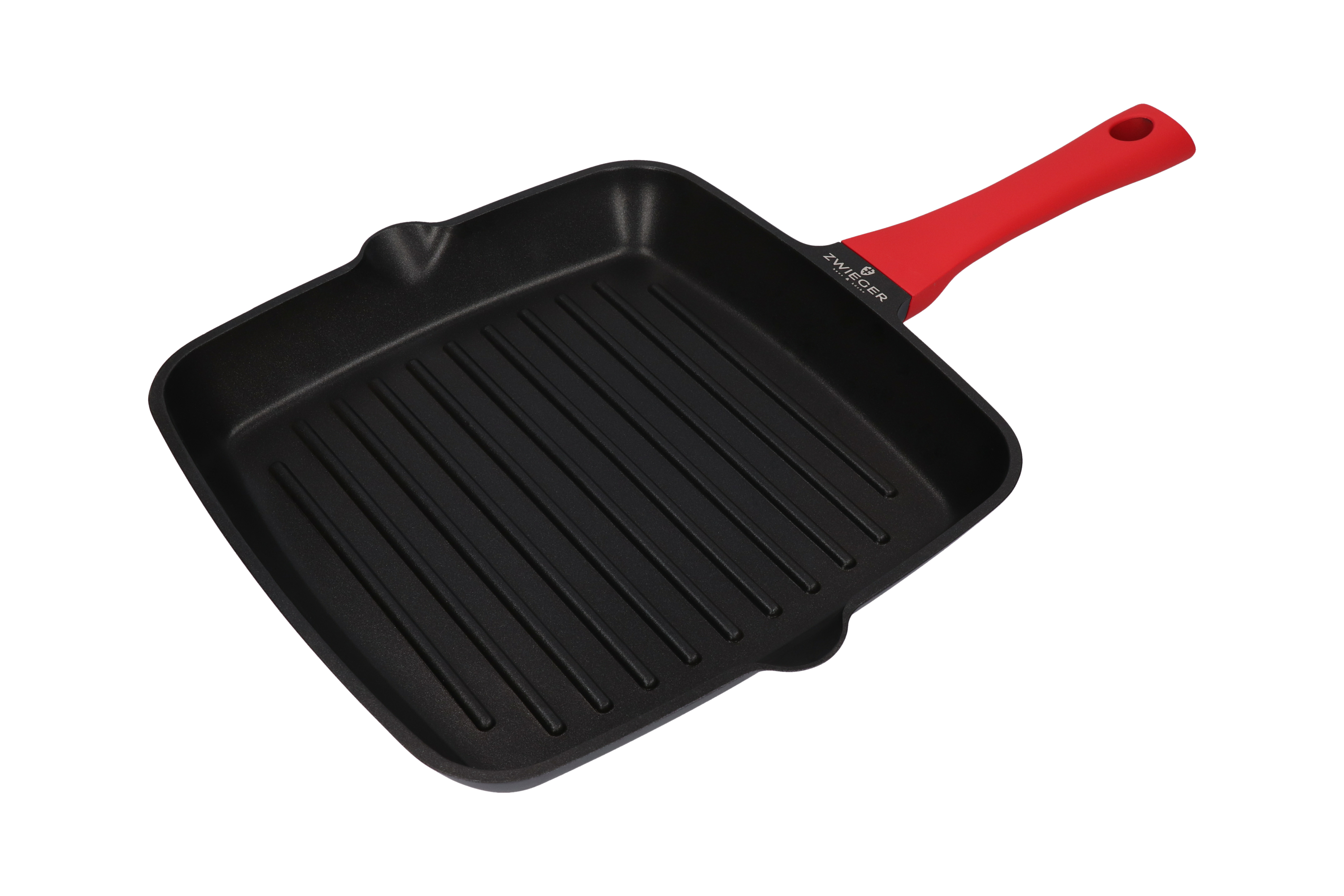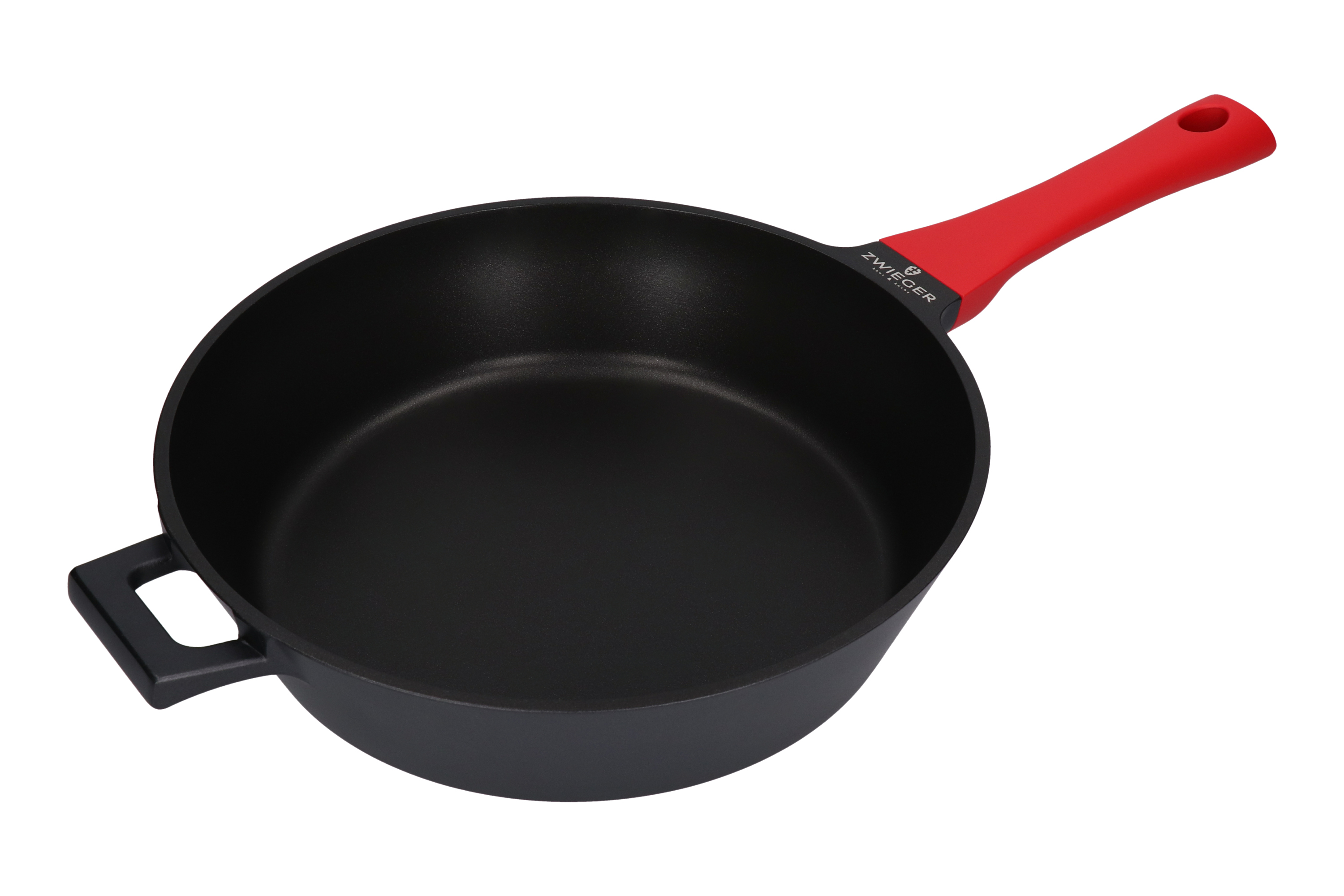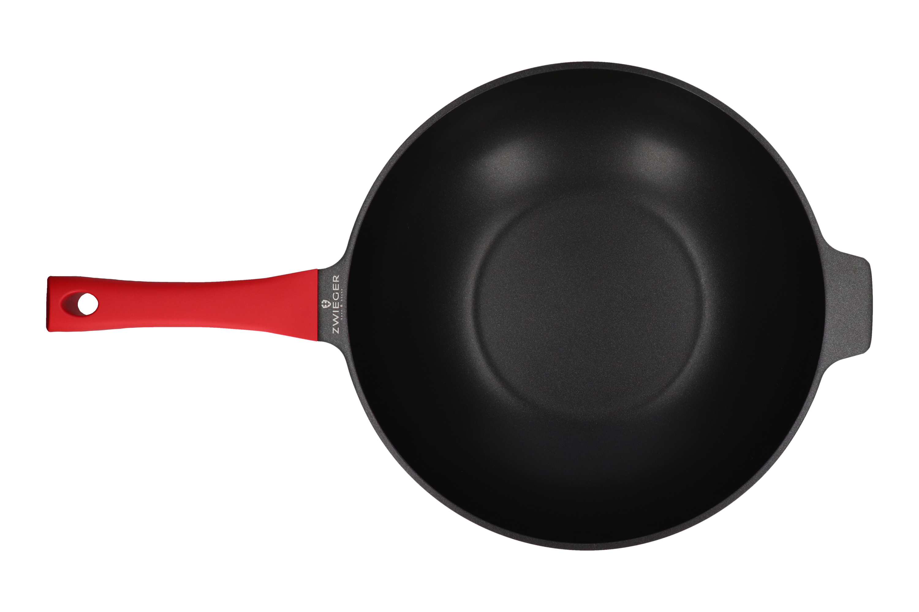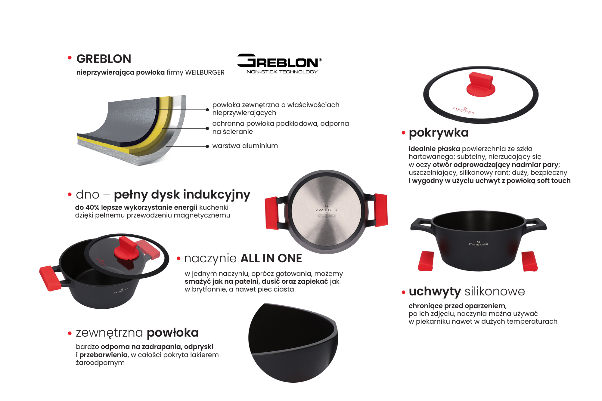 Patelnia Zwieger z odlewanego aluminium. Wewnętrzną część naczynia pokrywa innowacyjna, nieprzywierająca powłoka Greblon®. Ze względu na swoje wyjątkowe właściwości, zwiększające odporność na zarysowania, powłoka ta stosowana jest w naczyniach wysokiej klasy. Dodatkowo, żaroodporny lakier silikonowy, który pokrywa patelnię na zewnątrz, sprawia, że zachowuje ona swój estetyczny wygląd przez długi czas. Ponadto doskonale przewodzi i akumuluje ciepło. Patelnie można używać na wszystkich rodzajach kuchenek grzewczych, w tym na płytach indukcyjnych. Co więcej, użyty pełny dysk indukcyjny, dzięki pełnemu przewodzeniu magnetycznemu, zapewnia lepsze wykorzystanie energii sięgające aż do 40 %. Zastosowana nieprzywierająca powłoka pozwala smażyć przy minimalnym lub całkowitym braku zużycia tłuszczu, co niewątpliwie przekłada się na zdrowy tryb życia. Rączka została wykonana z materiału PP, który nie przewodzi ciepła, a także posiada specjalną powłokę soft touch, zapewniającą wygodny i pewny chwyt.