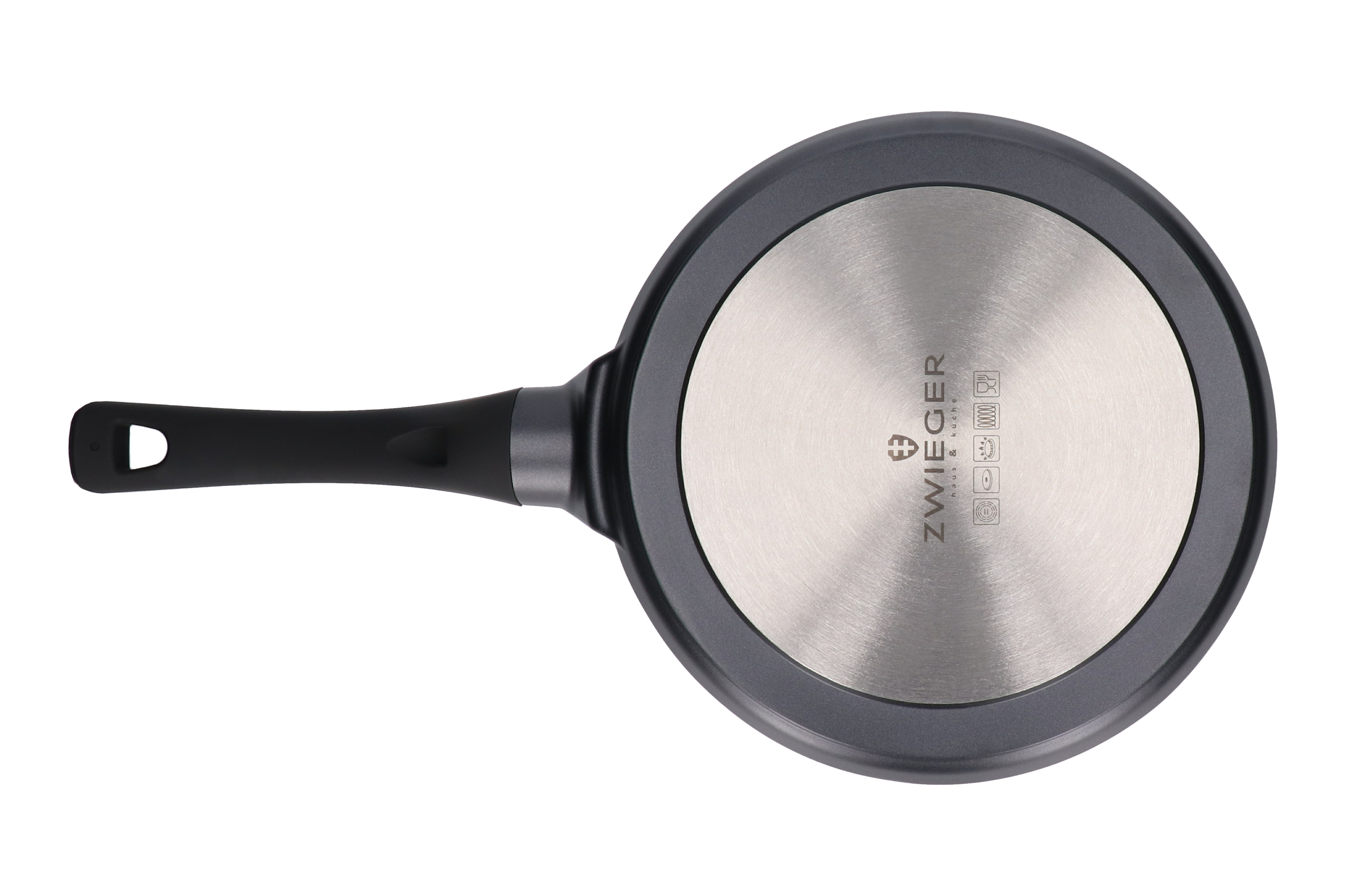 Patelnie Zwieger z odlewanego aluminium. Nowoczesna, niemiecka powłoka granitowa GREBLON® pokrywa wewnętrzną część naczynia. Dzięki nowatorskiej technologii, pozwalającej zredukować ilość powłok do trzech warstw, patelnia doskonale przewodzi i akumuluje ciepło. Ze względu na swoje wyjątkowe właściwości, zwiększające odporność na zarysowania, powłoka GREBLON® stosowana jest w naczyniach najwyższej klasy. Dodatkowo, żaroodporny lakier silikonowy, który pokrywa patelnię, sprawia, że zachowuje ona swój estetyczny wygląd na długo.