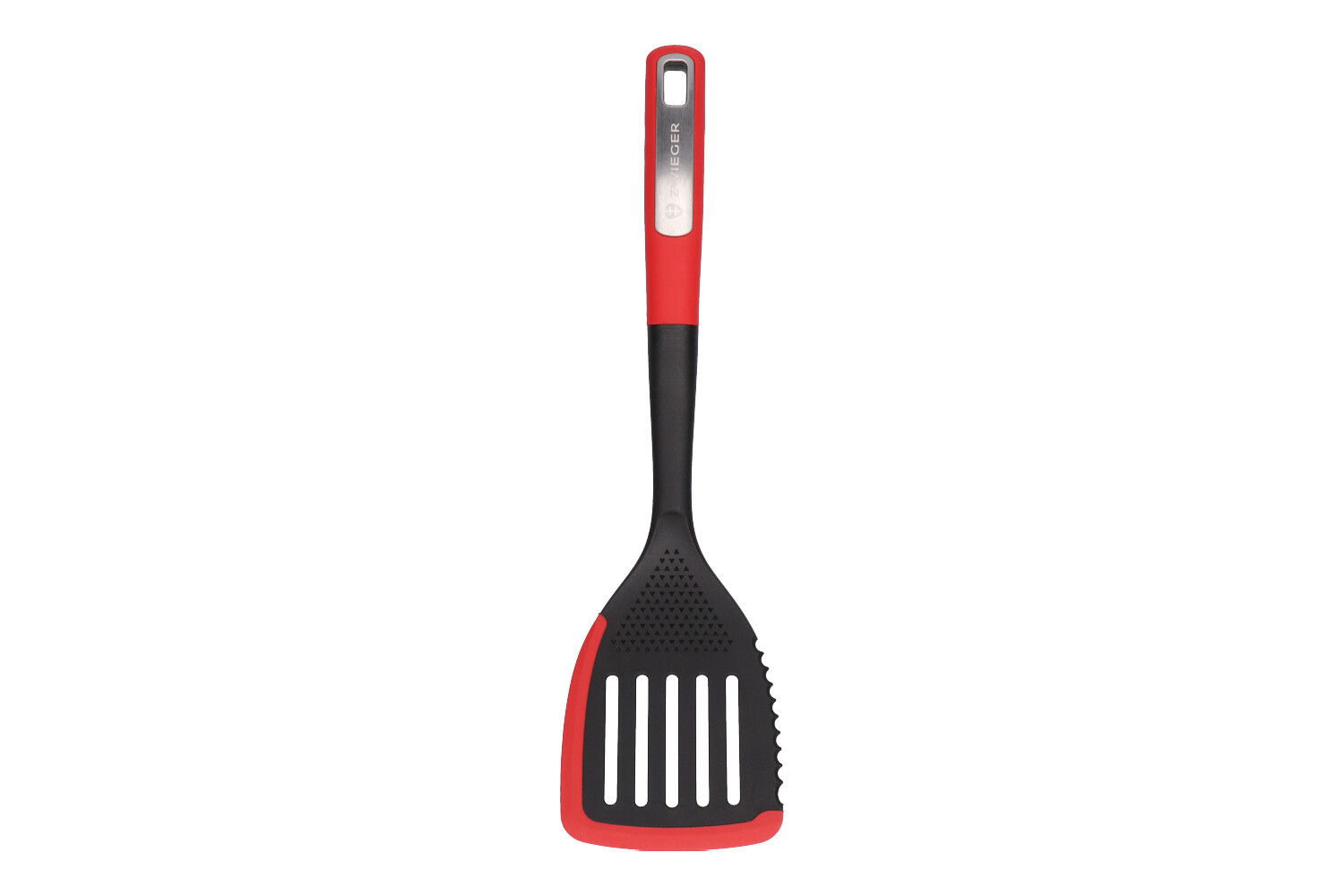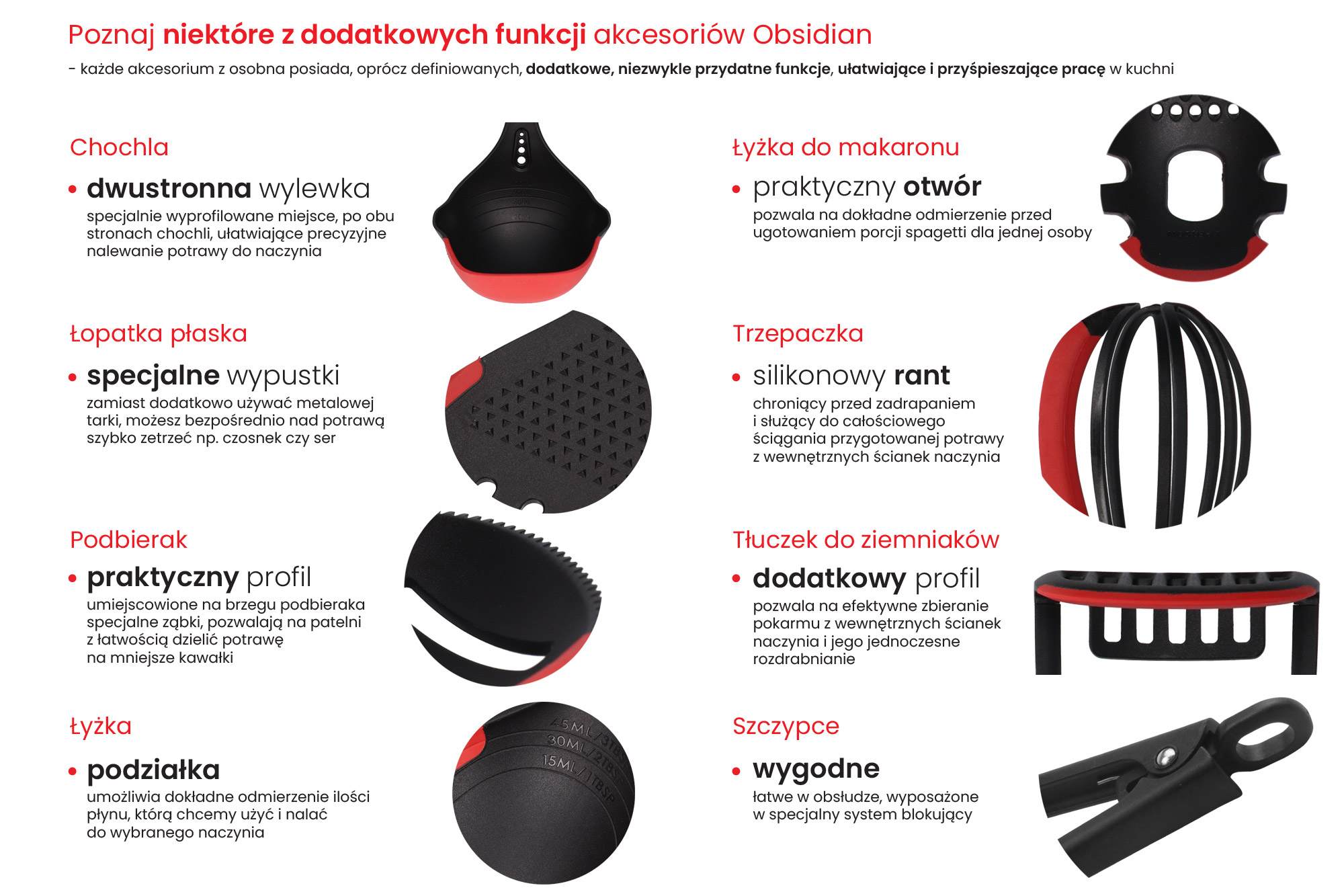 Niezwykła funkcjonalność i nowoczesna forma to cechy akcesoriów kuchennych z linii Obsidian. Wykonane zostały z nieprzetworzonego materiału z dodatkiem silikonu, a zaprojektowane z myślą o wysokim komforcie użytkowania. Dodatkowo, idealnie wyprofilowana, ergonomiczna rączka pokryta powłoką soft touch zapewnia wygodny i pewny chwyt. Co więcej, akcesoria można czyścić w zmywarkach mechanicznych lub równie efektywnie ręcznie, pod bieżącą wodą. Ze względu na swoją kolorystykę, materiał i design akcesoria te są idealnym uzupełnieniem patelni i garnków z linii Obsidian.