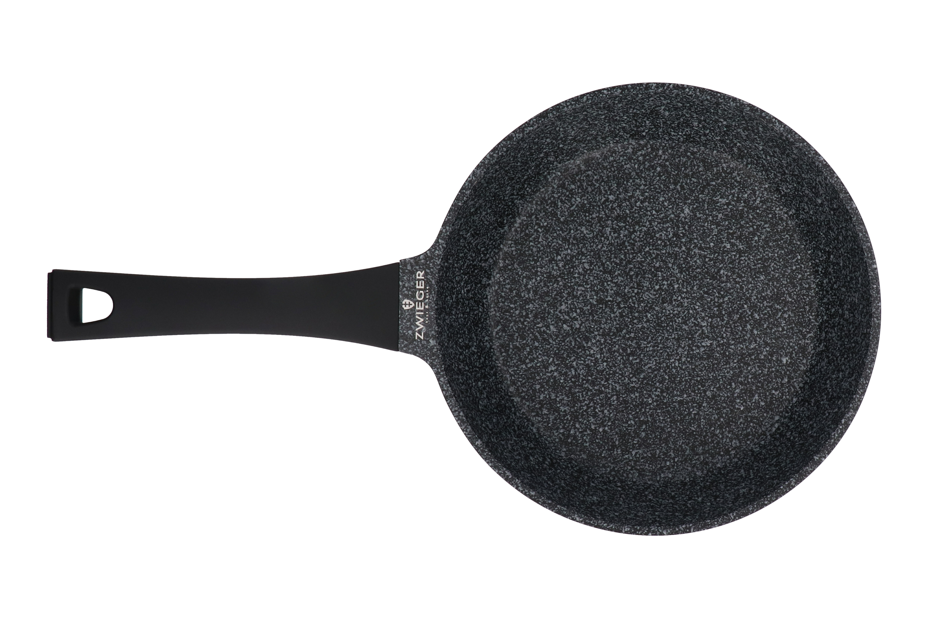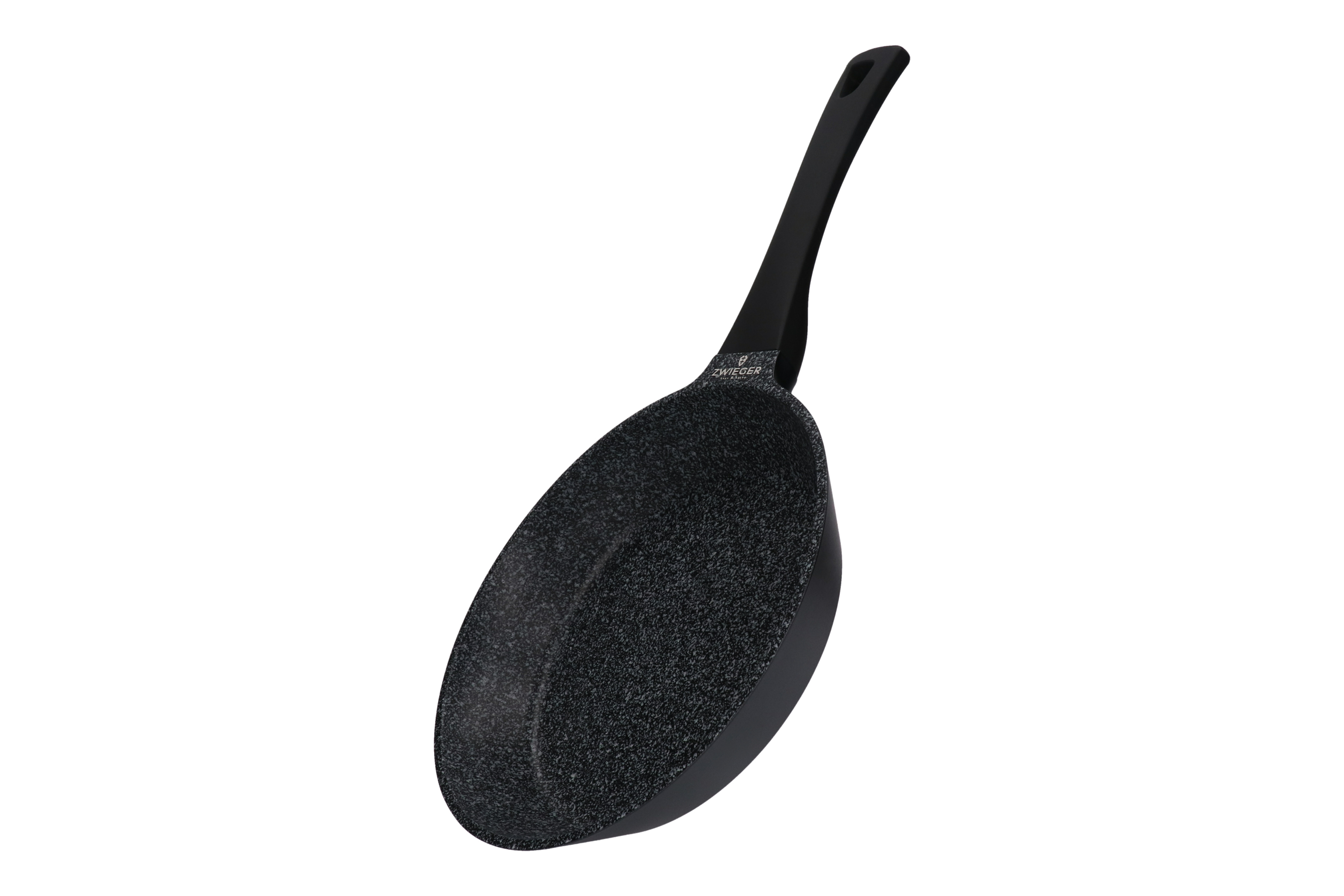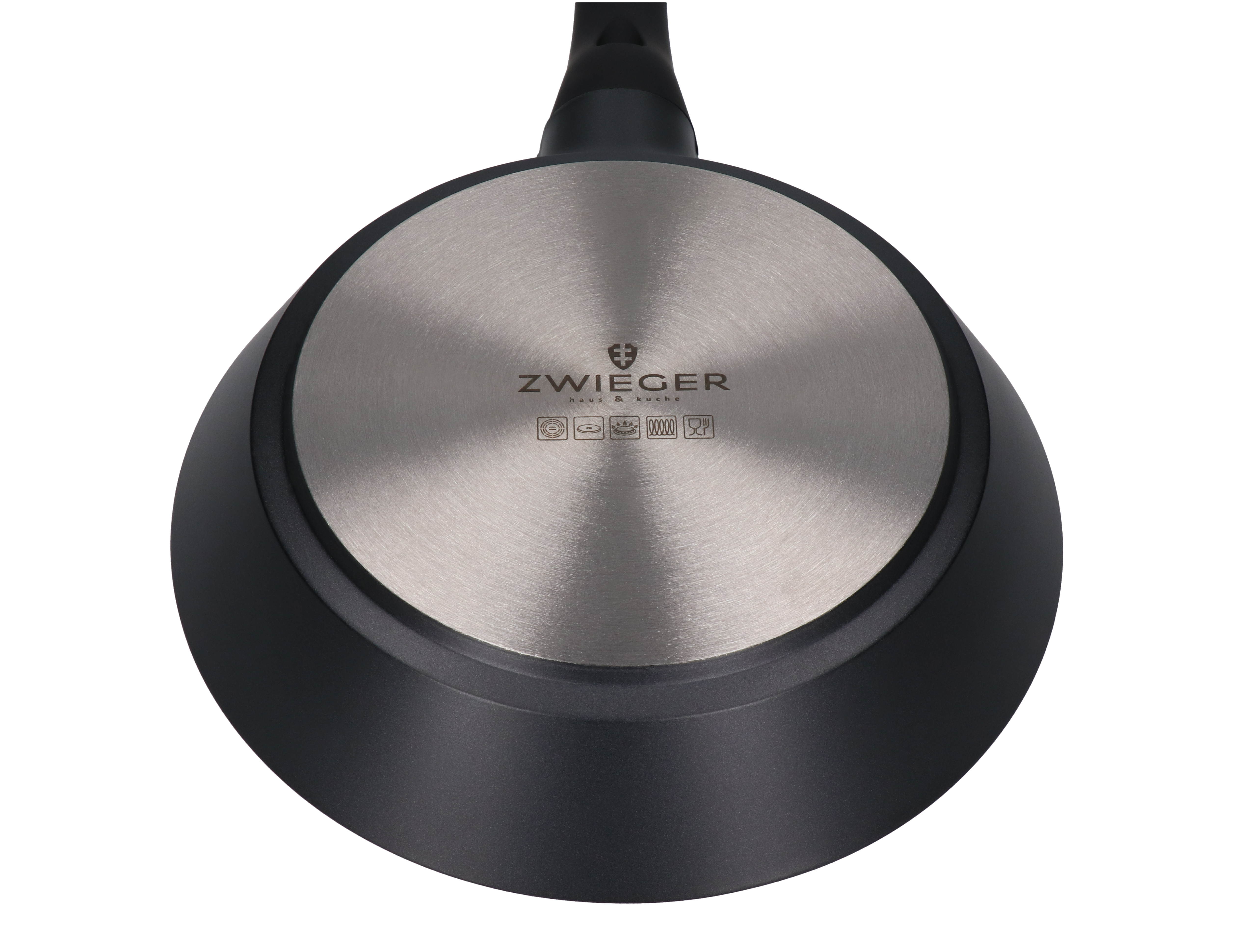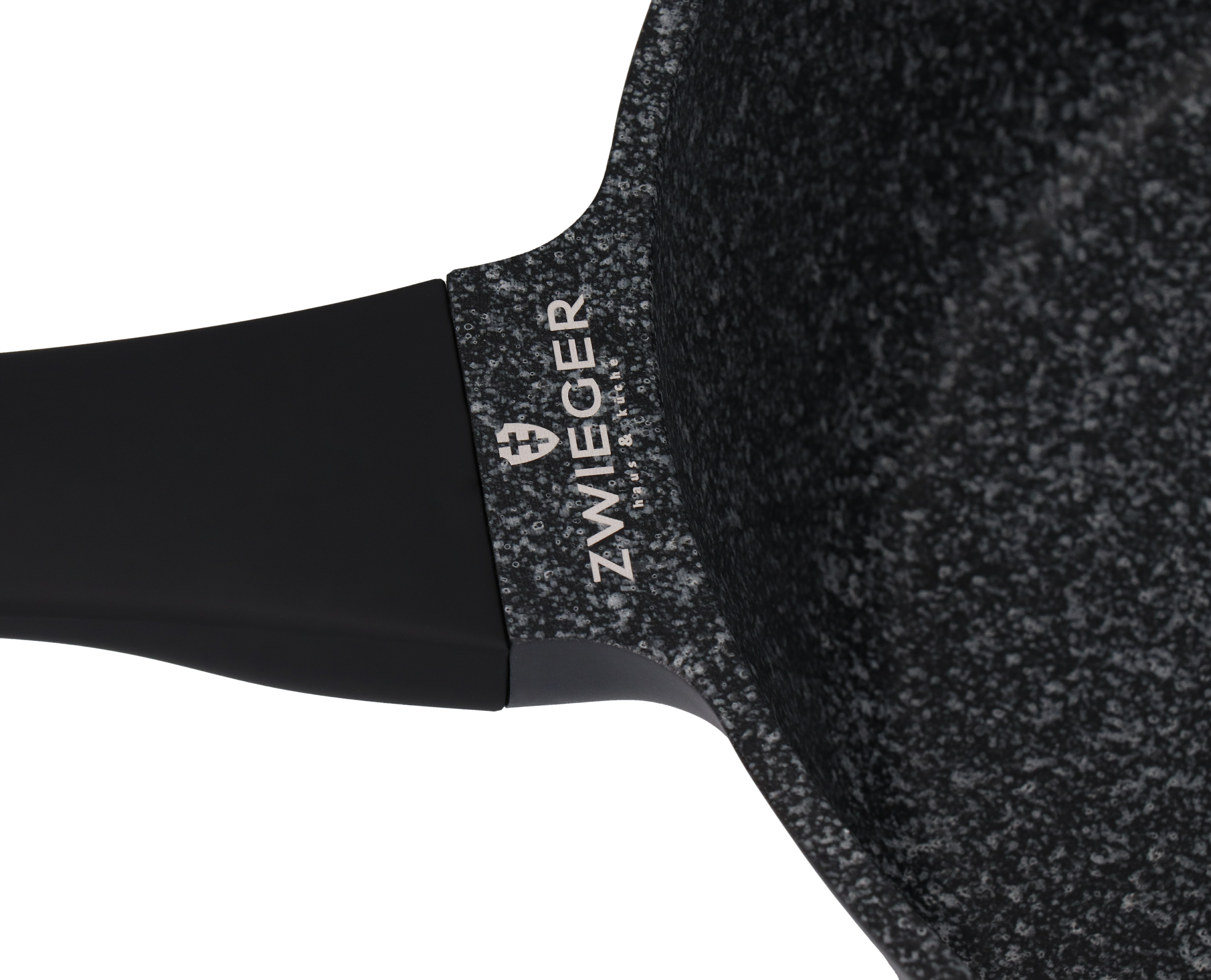 Patelnie Zwieger z odlewanego aluminium. Nowoczesna, niemiecka powłoka granitowa GREBLON® pokrywa wewnętrzną część naczynia. Dzięki nowatorskiej technologii, pozwalającej zredukować ilość powłok do trzech warstw, patelnia doskonale przewodzi i akumuluje ciepło. Ze względu na swoje wyjątkowe właściwości, zwiększające odporność na zarysowania, powłoka GREBLON® stosowana jest w naczyniach najwyższej klasy. Dodatkowo, żaroodporny lakier silikonowy, który pokrywa patelnię, sprawia, że zachowuje ona swój estetyczny wygląd na długo.