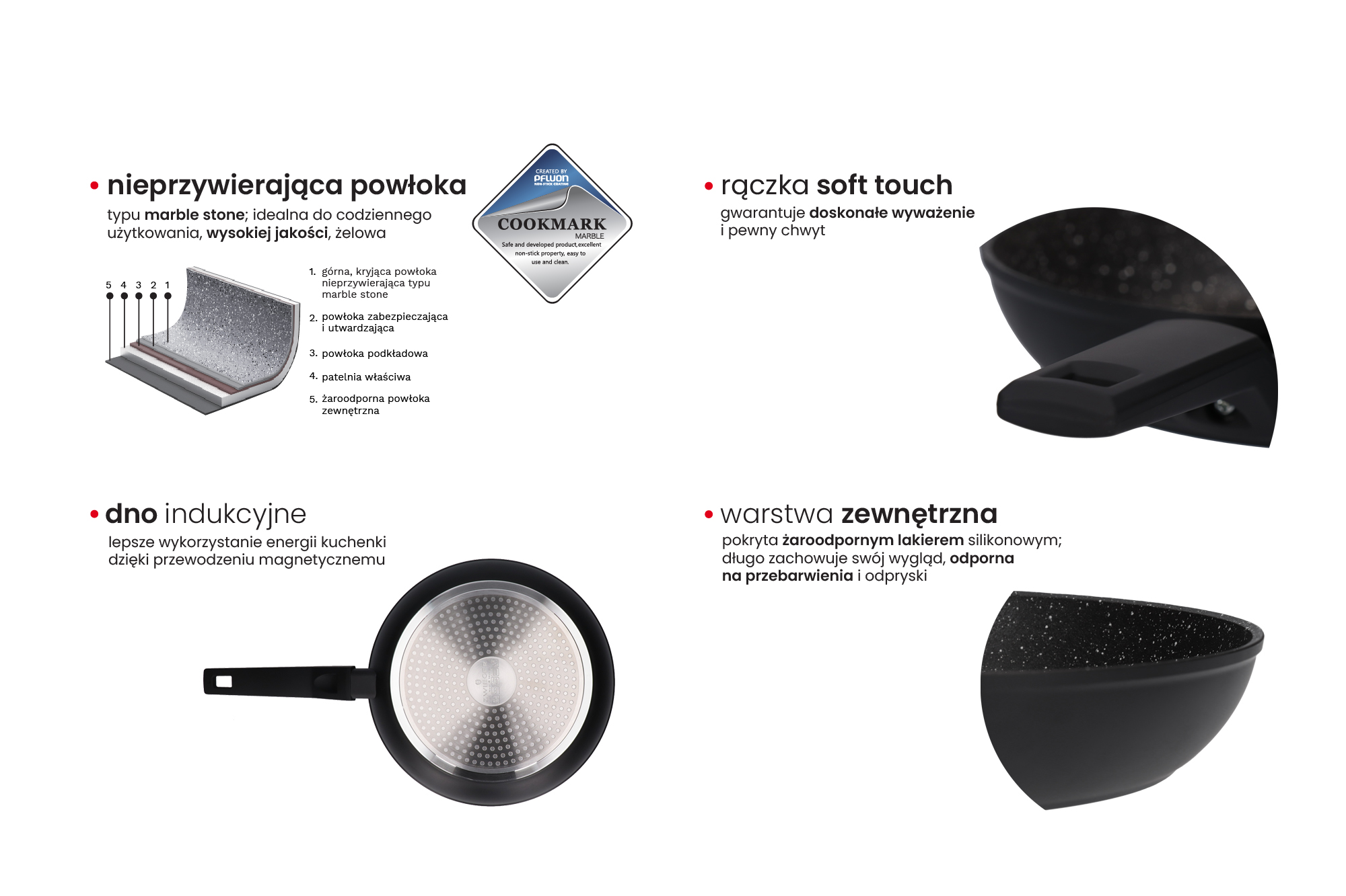 - POWŁOKA – wysokiej jakości, 4-warstwowa, nieprzywierająca, typu marble stone firmy PFLUON; do codziennych zastosowań