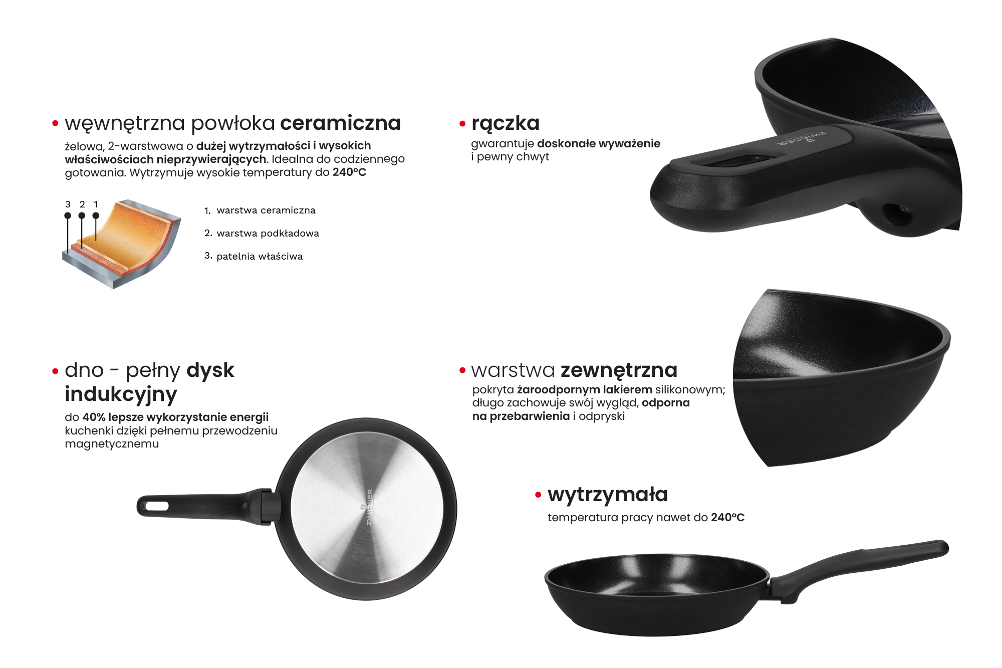 - POWŁOKA – wewnętrzna powłoka ceramiczna – żelowa, 2-warstwowa o dużej wytrzymałości i wysokich właściwościach nieprzywierających, idealna do codziennego smażenia, wytrzymuje wysokie temperatury do 240°C